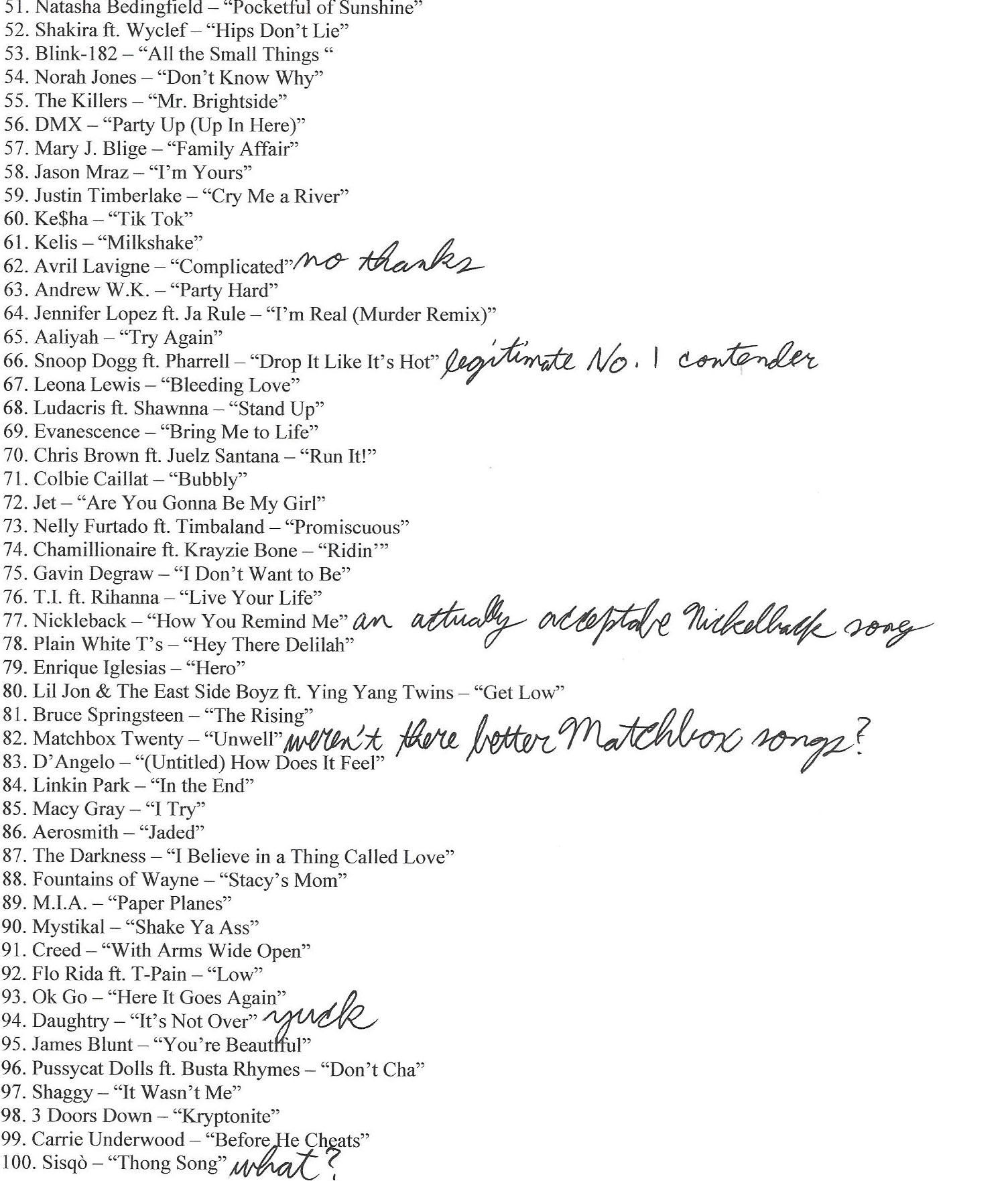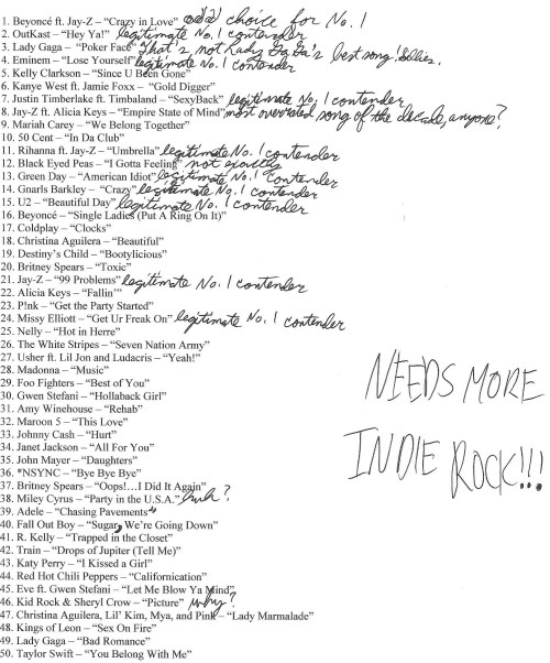 A few weeks ago, VH1 revealed their list of the 100 Greatest Songs of the 00’s. Naturally, here is my reaction: